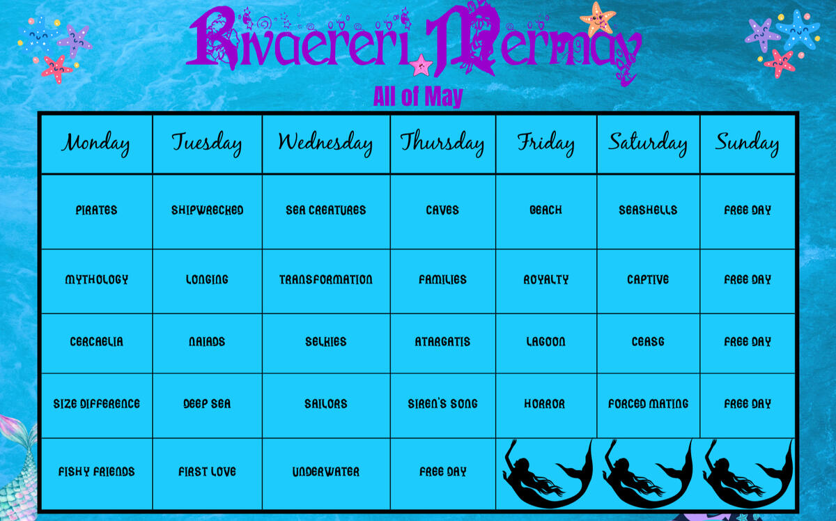 This event will have prompts for the entire month of Mermay! We are releasing the prompt list a month early so that creators feel that they have enough time to prepare their works. You can participate in all of the days or just a few, there is no minimum requirement and no limit! Anyone 18+ is welcome to participate. We will have a collection on Ao3 for the event and RT content from our Twitter account. Works for the first prompt should be posted on May 1st, and so on and so forth!There will be one prompt for each day. You can choose whichever one inspires you, and you can even incorporate multiple into one work for the day, but please don’t burn out!Prompts are for inspiration and don’t need to be followed strictly. Feel free to mix and match, or even make up your own. Possibilities are endless!